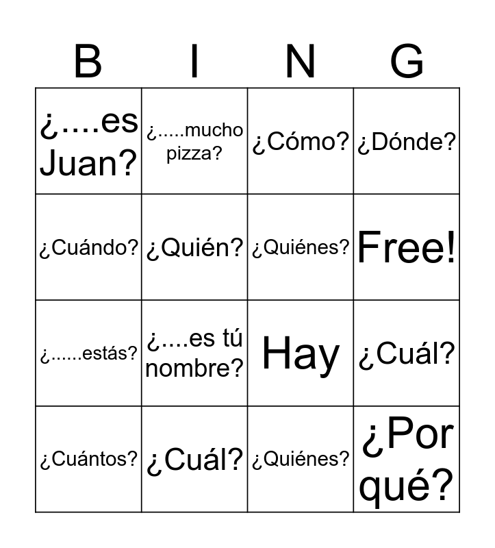 This bingo card has 18 words: ¿....es tú nombre?, ¿Por qué?, ¿Cómo?, ¿....es Juan?, Hay, ¿Dónde?, ¿Cuántos?, ¿.....mucho pizza?, Free!, ¿......estás?, ¿Quiénes?, ¿Cuándo?, ¿Cuál?, ¿Quién?, ¿Quiénes?, ¿Cuántos?, ¿Cuál? and ¿Cuáles?.