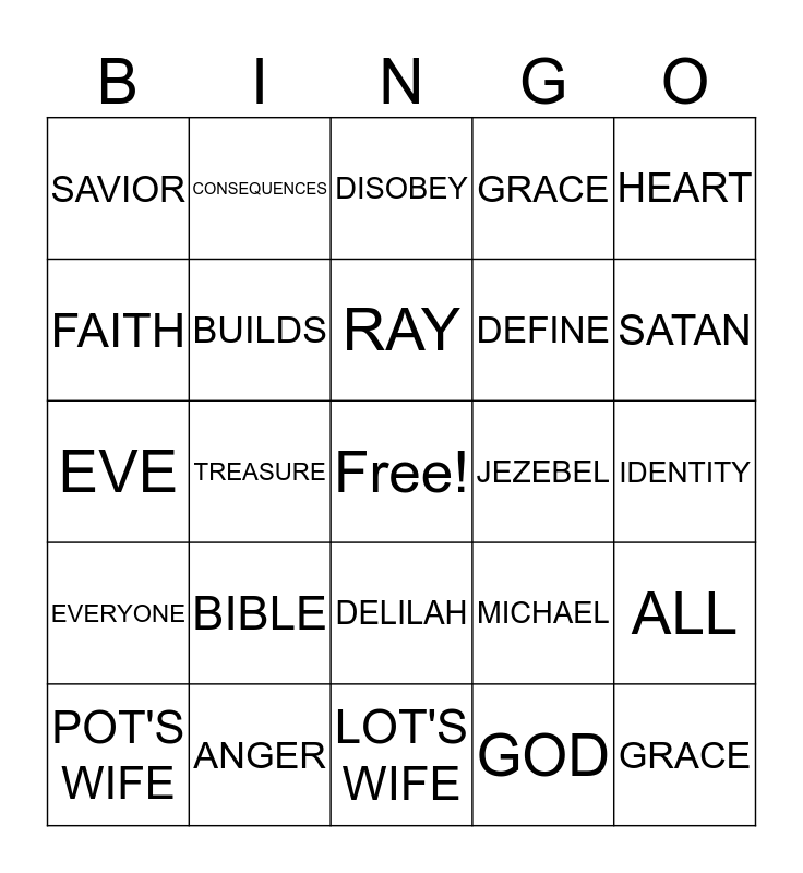 This bingo card has a free space and 24 words: BIBLE, ANGER, RAY, POT'S WIFE, HEART, SAVIOR, FAITH, CONSEQUENCES, JEZEBEL, DELILAH, DEFINE, EVE, MICHAEL, ALL, BUILDS, GOD, IDENTITY, DISOBEY, SATAN, TREASURE, GRACE, EVERYONE, GRACE and LOT'S WIFE.