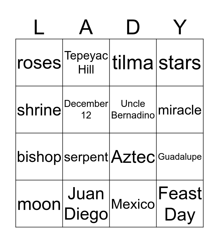 This bingo card has 16 words: Juan Diego, Guadalupe, tilma, roses, bishop, Tepeyac Hill, Aztec, Mexico, shrine, December 12, moon, stars, serpent, miracle, Uncle Bernadino and Feast Day.