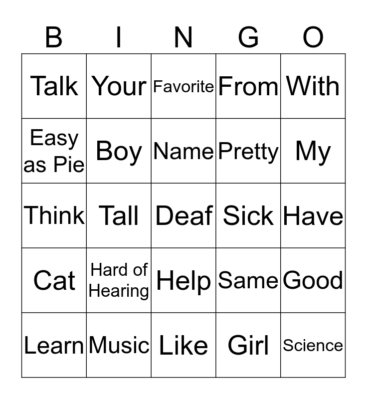 This bingo card has 44 words: Amateurish, Boy, Art, Spooky, Forever, Student, Your, Make, Pretty, Science, Easy as Pie, Tall, Deaf, Same, Math, Learn, Season, Name, Worry, My, Talk, How are You?, Like, From, Bat, Cat, Music, Nice to Meet You, Girl, Good, Dog, Hard of Hearing, Fun, About, Have, Short, Bad, Help, Sick, With, Think, Dream, Favorite and Different.