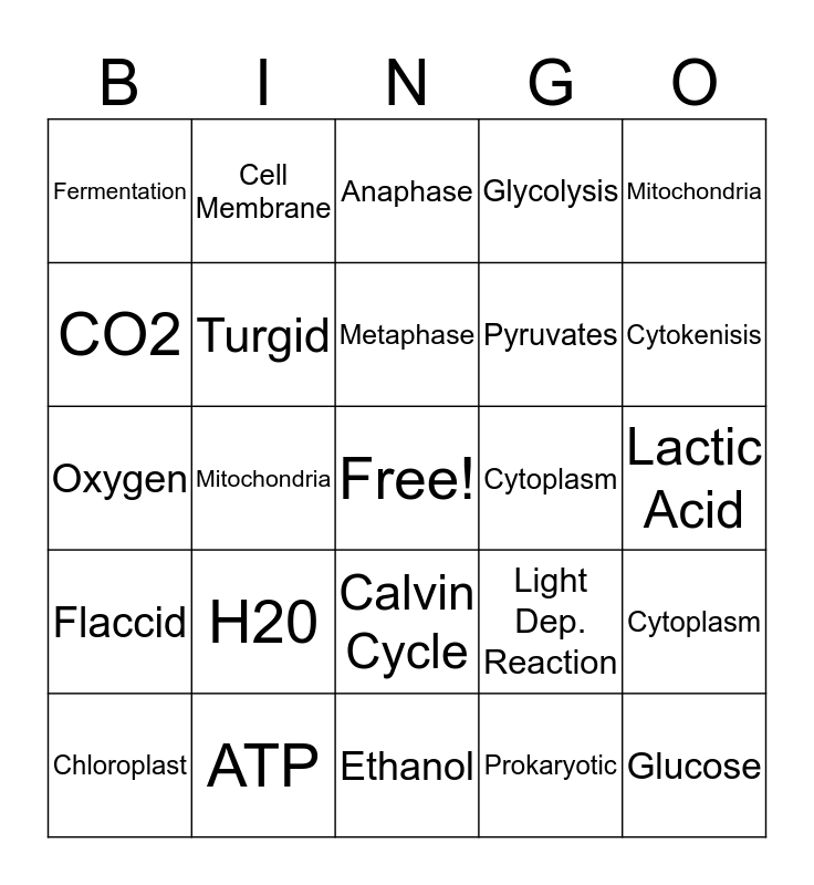 This bingo card has a free space and 34 words: Eukaryotic, Prokaryotic, Nucleus, Vacuole, Flaccid, Turgid, Mitochondria, Chloroplast, Cell Membrane, Cell Wall, Metaphase, Anaphase, Telophase, Interphase, Cytoplasm, Cytokenisis, ATP, Oxygen, H20, Light Dep. Reaction, Calvin Cycle, Kreb's Cycle, Fermentation, Lactic Acid, Ethanol, Glucose, Glycolysis, Electron Transport chain, Pyruvates, CO2, Stroma, Mitochondria, Cytoplasm and Thylakoid.