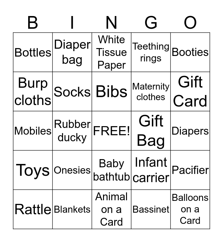 This bingo card has a free space and 26 words: Baby bathtub, Bassinet, Bibs, Blankets, Booties, Bottles, Burp cloths, Diaper bag, Diapers, Infant carrier, Maternity clothes, Mobiles, Pacifier, Rattle, Rubber ducky, Stuffed animals, Teething rings, Toys, White Tissue Paper, Balloons on a Card, Gift Card, Animal on a Card, Gift Bag, Onesies, Socks and Shoes.
