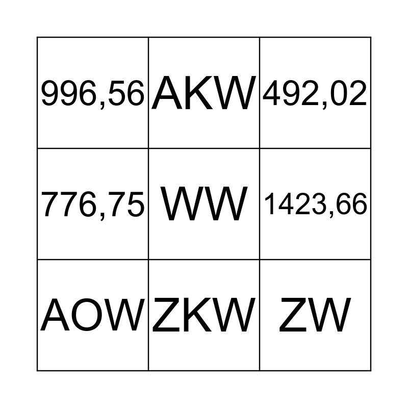 This bingo card has 14 words: Wlz, Anw, AOW, AKW, 776,75, WW, ZW, WIA, ZKW, 996,56, 1121,43, 1423,66, 492,02 and 246,01.