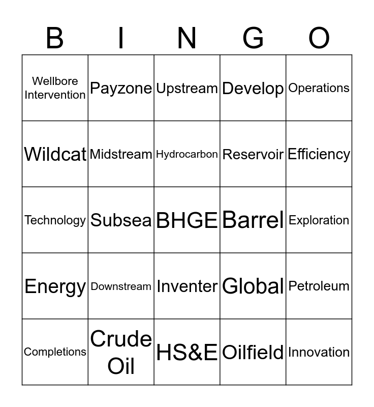 This bingo card has a free space and 29 words: Completions, Full Stream, Subsea, Completions, Wellbore Intervention, Upstream, Midstream, Downstream, Barrel, Crude Oil, Exploration, Innovation, HS&E, Oilfield, Efficiency, Digital, Inventer, Energy, Operations, Technology, Global, Unconventionals, Reservoir, Wildcat, Develop, Payzone, Petroleum, Hydrocarbon and Pioneer.