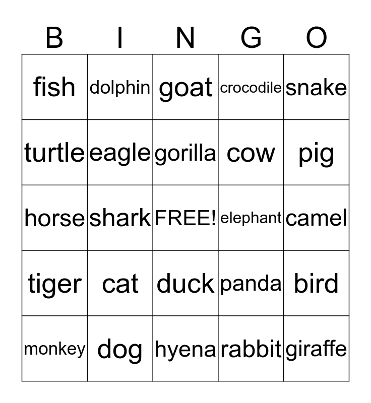 This bingo card has a free space and 24 words: cat, dog, gorilla, monkey, snake, fish, turtle, dolphin, elephant, duck, cow, horse, panda, bird, eagle, rabbit, camel, goat, pig, shark, giraffe, tiger, crocodile and hyena.