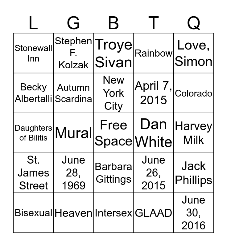 This bingo card has a free space and 24 words: June 28, 1969, Heaven, New York City, Bisexual, Love, Simon, Stonewall Inn, Becky Albertalli, Stephen F. Kolzak, Dan White, Barbara Gittings, April 7, 2015, Daughters of Bilitis, June 26, 2015, Jack Phillips, Autumn Scardina, GLAAD, Harvey Milk, Troye Sivan, Colorado, Mural, June 30, 2016, St. James Street, Rainbow and Intersex.
