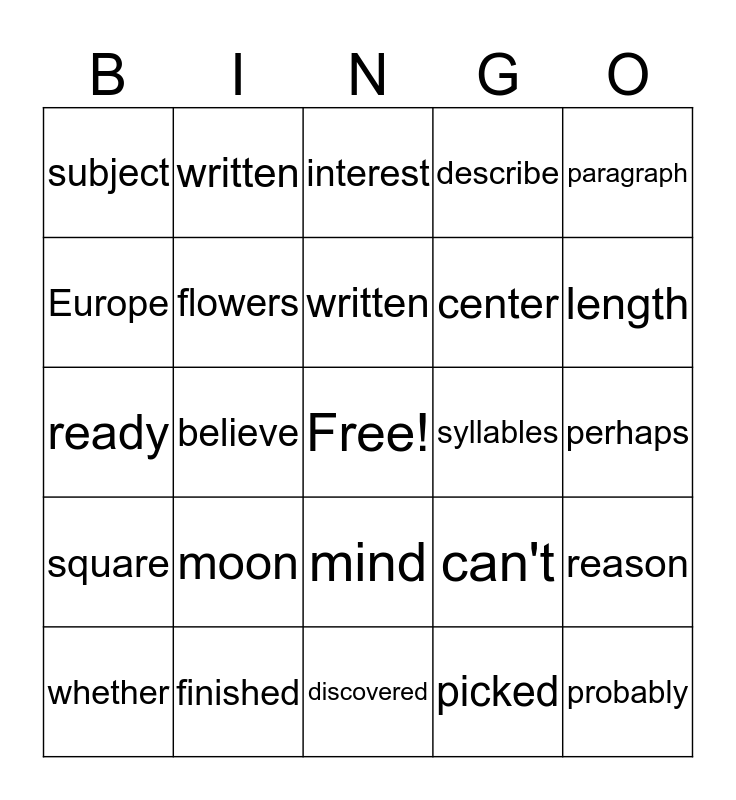 This bingo card has a free space and 24 words: moon, finished, written, whether, paragraph, subject, Europe, written, syllables, mind, center, ready, can't, reason, flowers, picked, perhaps, interest, length, believe, probably, square, describe and discovered.