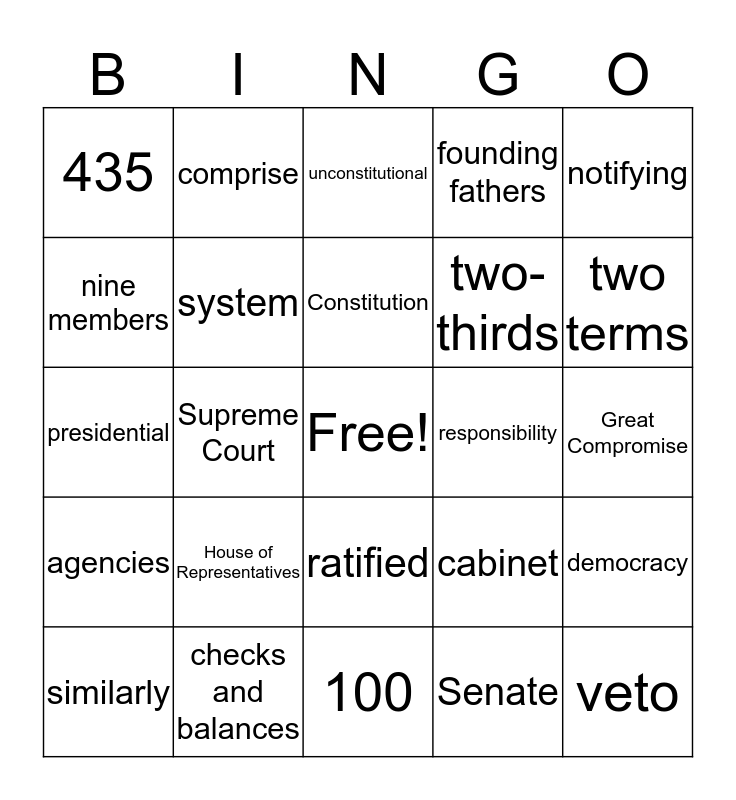 This bingo card has a free space and 32 words: Senate, senators, Supreme Court, justices, agencies, system, notifying, democracy, comprise, population, Constitution, unconstitutional, nominate, limitation, responsibility, impeachment, similarly, presidential, ratified, House of Representatives, cabinet, legislation, Great Compromise, checks and balances, veto, founding fathers, two-thirds, nine members, 435, 100, pardon and two terms.