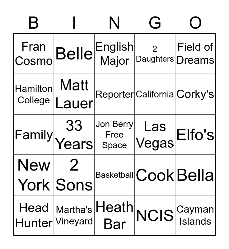 This bingo card has a free space and 24 words: 2 Sons, Martha's Vineyard, Reporter, Head Hunter, Field of Dreams, Fran Cosmo, Hamilton College, Belle, Las Vegas, Basketball, California, Family, Cook, Bella, Matt Lauer, NCIS, Elfo's, English Major, Corky's, 33 Years, Cayman Islands, New York, 2 Daughters and Heath Bar.