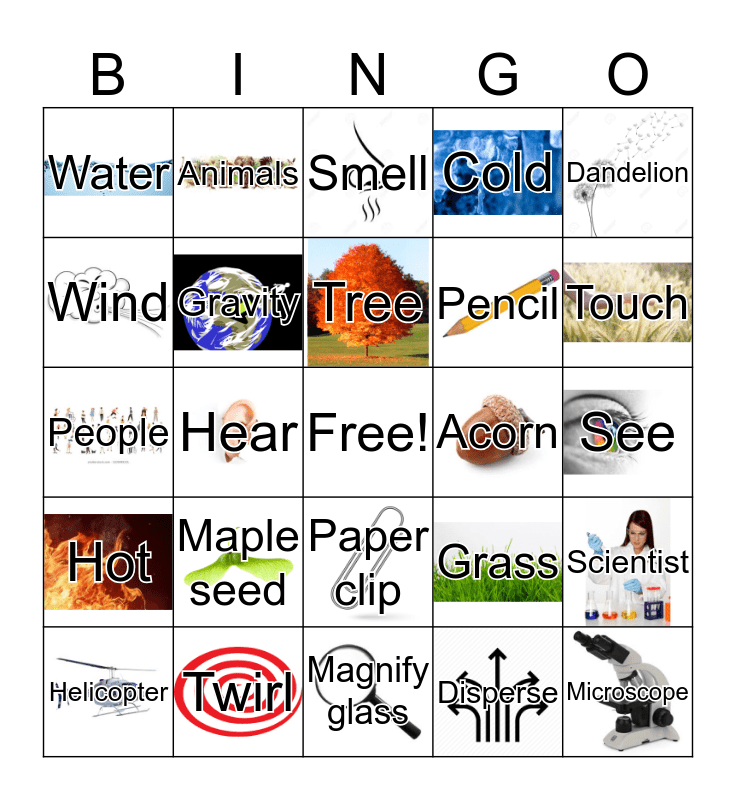 This bingo card has 25 images, a free space and 25 words: Maple seed, Magnify glass, Tree, Helicopter, Dandelion, Water, Wind, Animals, Acorn, Paper clip, Pencil, People, Grass, Scientist, Gravity, Notebook, See, Smell, Touch, Hear, Microscope, Twirl, Hot, Cold and Disperse.