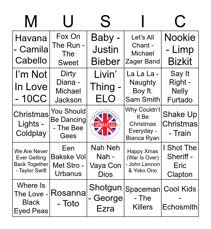 This bingo card has a free space and 24 words: Een Bakske Vol Met Stro - Urbanus, Rosanna - Toto, Livin’ Thing - ELO, Where Is The Love - Black Eyed Peas, Nookie - Limp Bizkit, Havana - Camila Cabello, I’m Not In Love - 10CC, Fox On The Run - The Sweet, Why Couldn’t It Be Christmas Everyday - Bianca Ryan, Nah Neh Nah - Vaya Con Dios, La La La - Naughty Boy ft. Sam Smith, Christmas Lights - Coldplay, Happy Xmas (War Is Over) - John Lennon & Yoko Ono, I Shot The Sheriff - Eric Clapton, Dirty Diana - Michael Jackson, Spaceman - The Killers, Shake Up Christmas - Train, Baby - Justin Bieber, Say It Right - Nelly Furtado, You Should Be Dancing - The Bee Gees, Cool Kids - Echosmith, We Are Never Ever Getting Back Together - Taylor Swift, Let’s All Chant - Michael Zager Band and Shotgun - George Ezra.
