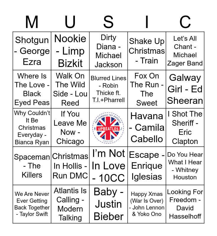 This bingo card has a free space and 24 words: Christmas In Hollis - Run DMC, Atlantis Is Calling - Modern Talking, Blurred Lines - Robin Thicke ft. T.I.+Pharrell, We Are Never Ever Getting Back Together - Taylor Swift, Let’s All Chant - Michael Zager Band, Shotgun - George Ezra, Where Is The Love - Black Eyed Peas, Nookie - Limp Bizkit, Havana - Camila Cabello, I’m Not In Love - 10CC, Fox On The Run - The Sweet, Why Couldn’t It Be Christmas Everyday - Bianca Ryan, Escape - Enrique Iglesias, Do You Hear What I Hear - Whitney Houston, Walk On The Wild Side - Lou Reed, Happy Xmas (War Is Over) - John Lennon & Yoko Ono, I Shot The Sheriff - Eric Clapton, Dirty Diana - Michael Jackson, Galway Girl - Ed Sheeran, If You Leave Me Now - Chicago, Looking For Freedom - David Hasselhoff, Spaceman - The Killers, Shake Up Christmas - Train and Baby - Justin Bieber.