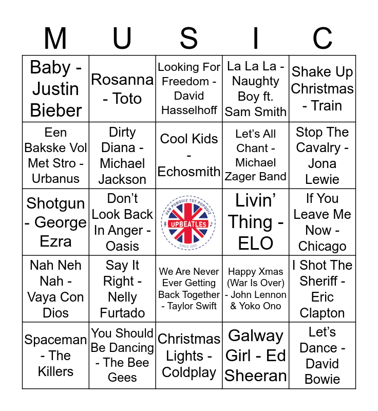 This bingo card has a free space and 24 words: Say It Right - Nelly Furtado, You Should Be Dancing - The Bee Gees, Cool Kids - Echosmith, Spaceman - The Killers, Shake Up Christmas - Train, Baby - Justin Bieber, Een Bakske Vol Met Stro - Urbanus, Rosanna - Toto, Livin’ Thing - ELO, We Are Never Ever Getting Back Together - Taylor Swift, Let’s All Chant - Michael Zager Band, Shotgun - George Ezra, Happy Xmas (War Is Over) - John Lennon & Yoko Ono, I Shot The Sheriff - Eric Clapton, Dirty Diana - Michael Jackson, Galway Girl - Ed Sheeran, If You Leave Me Now - Chicago, Looking For Freedom - David Hasselhoff, Stop The Cavalry - Jona Lewie, Don’t Look Back In Anger - Oasis, Let’s Dance - David Bowie, Nah Neh Nah - Vaya Con Dios, La La La - Naughty Boy ft. Sam Smith and Christmas Lights - Coldplay.
