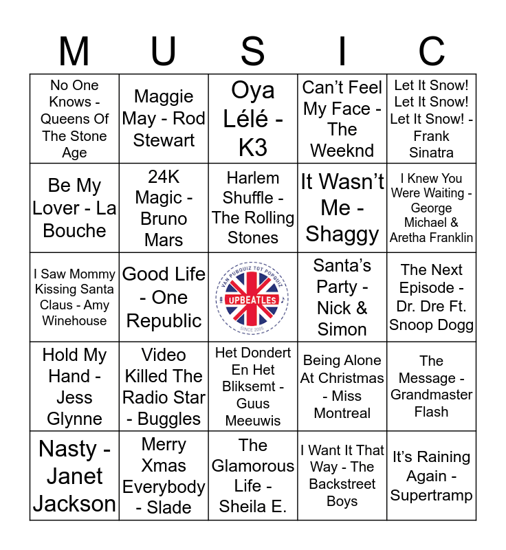 This bingo card has a free space and 24 words: Video Killed The Radio Star - Buggles, Merry Xmas Everybody - Slade, Harlem Shuffle - The Rolling Stones, Nasty - Janet Jackson, Let It Snow! Let It Snow! Let It Snow! - Frank Sinatra, No One Knows - Queens Of The Stone Age, Be My Lover - La Bouche, Maggie May - Rod Stewart, Santa’s Party - Nick & Simon, Het Dondert En Het Bliksemt - Guus Meeuwis, It Wasn’t Me - Shaggy, I Saw Mommy Kissing Santa Claus - Amy Winehouse, Being Alone At Christmas - Miss Montreal, The Message - Grandmaster Flash, 24K Magic - Bruno Mars, I Want It That Way - The Backstreet Boys, The Next Episode - Dr. Dre Ft. Snoop Dogg, Oya Lélé - K3, I Knew You Were Waiting - George Michael & Aretha Franklin, Good Life - One Republic, It’s Raining Again - Supertramp, Hold My Hand - Jess Glynne, Can’t Feel My Face - The Weeknd and The Glamorous Life - Sheila E..