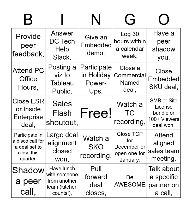 This bingo card has a free space and 25 words: Large deal alignment closed won,, Pull forward deal closes,, Participate in Holiday Power-Ups,, Shadow a peer call,, Have a peer shadow you,, Provide peer feedback,, Attend PC Office Hours,, Answer DC Tech Help Slack,, Watch a TC recording,, Watch a SKO recording,, Close a Commercial Named deal,, Close ESR or Inside Enterprise deal,, Close TCP for December or open one for January,, Attend aligned sales team meeting,, Posting a viz to Tableau Public,, Close deal > 50K,, SMB or Site License bundle or 100+ Viewers deal won,, Give an Embedded demo,, Close Embedded SKU deal,, Sales Flash shoutout,, Talk about a specific partner on a call,, Have lunch with someone from another team (kitchen counts!),, Participate in a disco call for a deal set to close this quarter,, Log 30 hours within a calendar week, and Be AWESOME.
