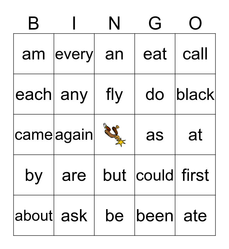 This bingo card has a free space and 29 words: about, after, again, all, am, an, any, are, as, ask, at, ate, be, been, black, brown, but, by, call, came, could, day, do, each, eat, every, first, fly and four.