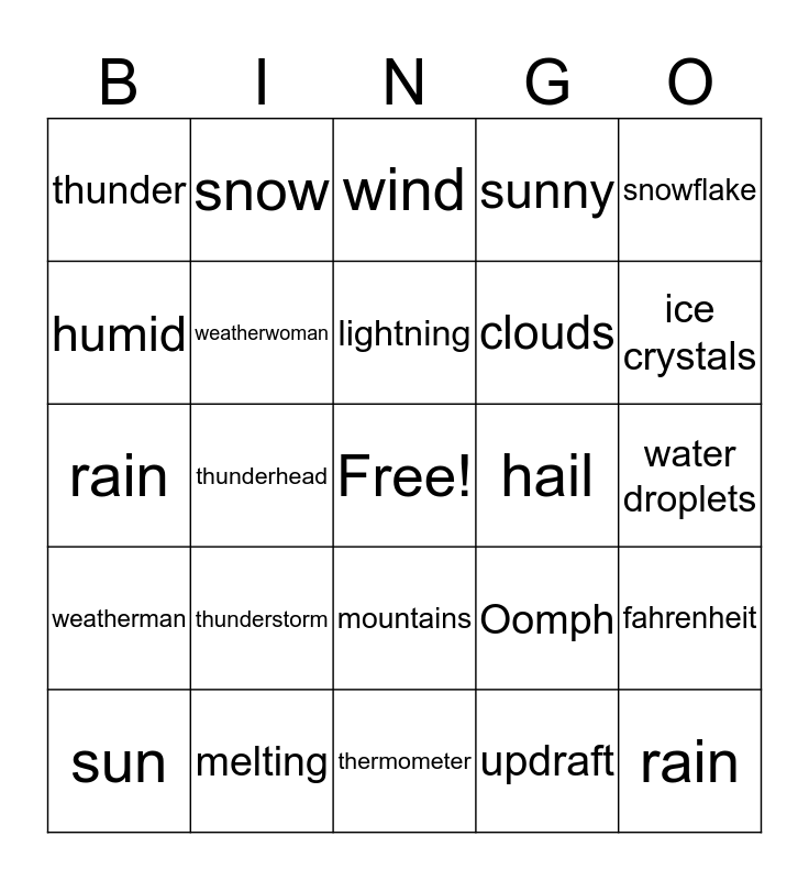 This bingo card has a free space and 24 words: thunderstorm, melting, lightning, sun, snowflake, thunder, humid, snow, hail, mountains, clouds, rain, Oomph, fahrenheit, weatherwoman, updraft, water droplets, wind, ice crystals, thunderhead, rain, weatherman, sunny and thermometer.