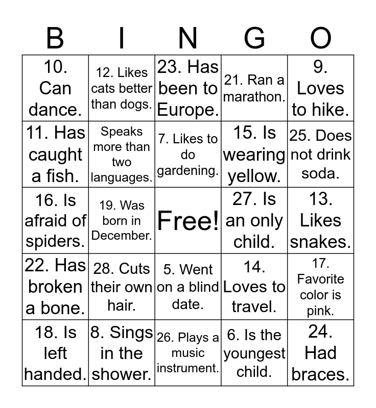 This bingo card has a free space and 26 words: 5. Went on a blind date., 6. Is the youngest child., 7. Likes to do gardening., 8. Sings in the shower., 9. Loves to hike., 10. Can dance., 11. Has caught a fish., 12. Likes cats better than dogs., 13. Likes snakes., 14. Loves to travel., 15. Is wearing yellow., 16. Is afraid of spiders., 17. Favorite color is pink., 18. Is left handed., 19. Was born in December., 20. Has curly hair., 21. Ran a marathon., 22. Has broken a bone., 23. Has been to Europe., 24. Had braces., 25. Does not drink soda., 26. Plays a music instrument., 27. Is an only child., 28. Cuts their own hair., Speaks more than two languages. and Has been scuba diving..