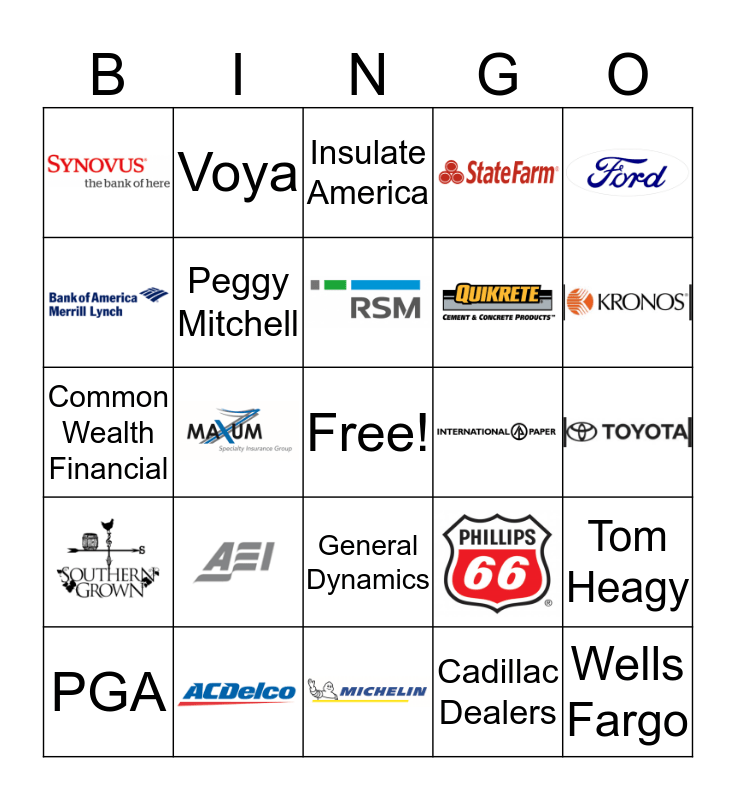 This bingo card has 15 images, a free space and 9 words: PGA, Voya, General Dynamics, Common Wealth Financial, Tom Heagy, Peggy Mitchell, Cadillac Dealers, Insulate America and Wells Fargo.