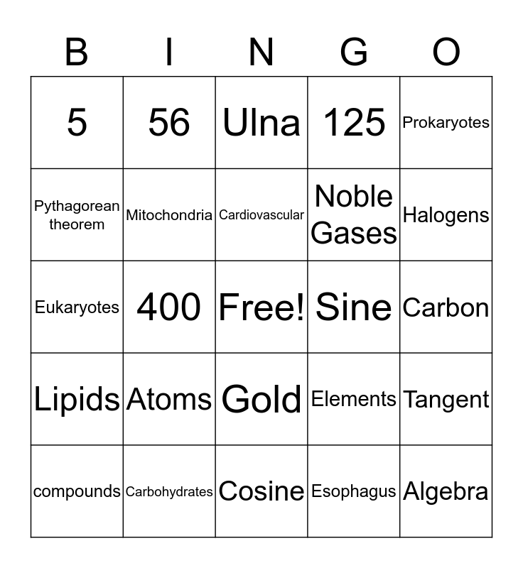 This bingo card has a free space and 49 words: Biology, Algebra, Skin, Cosine, Atoms, Cell, 56, Brain, Pythagorean theorem, Chemistry, Mitochondria, 125, Tangent, Elements, Evolution, x=6, Cardiovascular, Sine, Covalent Bonds, Prokaryotes, 400, Esophagus, 5, Noble Gases, Trignometry, Halogens, compounds, Chemical formula, Gold, Lipids, Proteins, Rough ER, Oxygen, Copper, Carbohydrates, 20, polynomials, 169, Carbon, binomials, Secant (sec), Cosecant (csc), Nucleus, Alkali Metal, Eukaryotes, Ulna, Patella, Femur and Mandible.