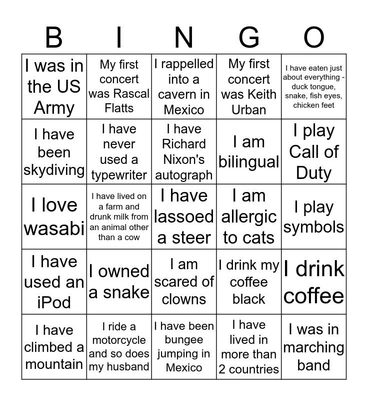 This bingo card has 159 words: Free!, I have seen the Rolling Stones in concert 7 times, Elephants are my favorite animal, I have more than 20 of them around my house (not real ones of course), I am a lefty, I am a millennial that has used a typewriter, I am a weather junkie (I watch weather reports as often as possible), I am afraid of heights, I am afraid of spiders, I am afraid of spiders and heights, I am afraid of spiders and my husband has milked a cow, I am allergic to cats, I am allergic to shrimp, I am bilingual, I am good at drawing/painting, I am scared of clowns, I am terrified of snakes and wish I could get my coffee in an IV drip, I build props for a high school marching band, I can lasso a steer, I cannot swim, I cross stitches elaborate scenes, I do calligraphy, I do not drink coffee, I do not make New Year's Resolutions, I do not watch TV, I don’t have a Facebook page, I drink beer, I drink coffee, I drink my coffee black, I drink wine, I floss my teeth twice a day, I had a blue iPod Mini that I loved!, I hate all insects, I hate shrimp but my girlfriend loves shrimp, I have 2 cats, I have a 15 year old cat, I have a Bernese Mountain Dog, I have a cat, I have a cat named Isabel (Izzy for short), I have a celebrity autograph, I have a Boxer, I have a Facebook page, I have a Facebook page but my husband does not, I have a fish tank, I have a Golden Retriever, I have a great grandfather who was convicted of murder, I have a Greyhound and an Italian Greyhound, I have a lab mix named C.C., I have a mini Australian Shepherd dog, I have a retriever mix dog, I have a sister that is 3 years older than my daughter, I have a Treeing Walker Coonhound dog, I have been bungee jumping in Mexico, I have been in the military, I have been skydiving, I have been to a Yanni concert, I have climbed a mountain, I have Doctor J's autography (Julius Erving), I have drunk camel milk, I have drunk milk from an animal other than a cow, I have eaten crickets and ants, I have eaten just about everything - duck tongue, snake, fish eyes, chicken feet, I have lassoed a steer, I have lived in more than 2 countries, I have lived in the US, Germany, and France, I have lived in Vietnam, I have lived on a farm and drunk milk from an animal other than a cow, I have milked a cow, I have milked a cow and my wife is afraid of spiders, I have more than 1 cat, I have never used a typewriter, I have played in a band, I have played many instruments. Alto Saxophone, Trumpet, Tuba, Drums, Acoustic guitar, I have Richard Nixon's autograph, I have Tisha Campbell's autograph, I have used a typewriter, I have used an iPod, I have used an iPod, I have visited 6 continents, I have visited 8 countries and 3 continents, I have willingly eaten insects, I hiked Sugarloaf Mountain in Rio de Janeiro, I kill house plants, I kill house plants, love road trips, and love shrimp, I like hiking, I like the cold vs heat, I lived on a farm, I love coconut cake, I love line dancing, I love line dancing and used to dance ballet, I love shrimp but my boyfriend hates shrimp, I love shrimp, I love shrimp and all other things seafood, I love shrimp and I am allergic to cats, I love the Pittsburgh Steelers (even though they suck this year), I love wasabi, I make New Year's Resolutions, I meditate regularly, I milked a cow on a field trip, I never make New Year's Resolutions, I owned a snake, I painted houses as college summer job., I play Call of Duty, I play symbols, I play the flute and piano, I play the guitar, I play the piano and my wife plays guitar, I play the violin, I play the violin and ukulele, I rappelled into a cavern in Mexico, I read for pleasure, I ride a motorcycle, I ride a motorcycle and so does my husband, I ride a motorcycle and so does my wife, I routinely climb trees, I speak French fluently, I tell people I am allergic to cats because I hate cats, I took a 2-week train adventure across Canada, I wake up before 7 am on the weekends, I wake up before 7 am on the weekends and meditate regularly, I walk under ladders, I was a referee for soccer at age 12, then 32, then 45. Never again., I was in marching band, I was in the military, I was in the US Army, I was in the USMC and Naval Academy, I was the captain of my high school swim team, I watch America's Funniest Home Videos, I watch Food Network, I wear socks to bed, I won $1,000 on a scratch off lottery ticket, I won $1,200 in the lottery, I wore headgear as a kid, I worked as a zookeeper for 2 years in Ohio, My daughter speaks French fluently, My favorite musical artist is Post Malone, My favorite vacation spot is the beach, My first concert was Rascal Flatts, My first concert was Al Jarreau, My first concert was Cheap Trick, My first concert was Cool & the Gang, My first concert was Cute is What We Aim For, My first concert was Garth Brooks, My first concert was Jackson 5, My first concert was Keith Urban, My first concert was Kenny Rogers, My first concert was Miyavi, My first concert was Ronnie James Dio, My first concert was Third Eye Blind, My first concert was Tom Petty and the Heartbreakers, My first concert was U2, My husband and I both watch TV, drink coffee, and are right handed, My husband is a lefty, My wife and I both watch TV, drink coffee, and are right handed, My wife has a Facebook page but I do not, My wife has played in a band, My wife loves line dancing, My wife loves line dancing and used to dance ballet, My wife plays guitar and I play piano and Shrimp is my favorite food.