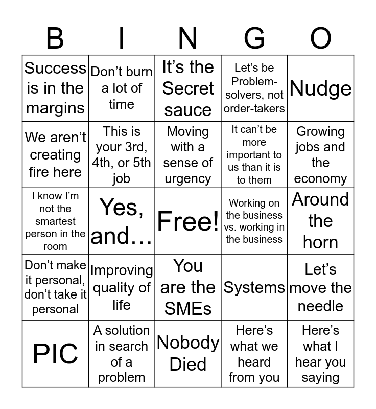 This bingo card has a free space and 28 words: Let’s move the needle, It’s gonna get worse before it gets better, It can’t be more important to us than it is to them, Here’s what we heard from you, We aren’t creating fire here, It’s the Secret sauce, Don’t burn a lot of time, Don’t make it personal, don’t take it personal, Working on the business vs. working in the business, PIC, I know I’m not the smartest person in the room, Let’s be Problem-solvers, not order-takers, A solution in search of a problem, Nobody Died, Growing jobs and the economy, Controlling cost of government, Improving quality of life, This is your 3rd, 4th, or 5th job, Moving with a sense of urgency, You are the SMEs, Success is in the margins, We want an emotional response, Here’s what I hear you saying, Yes, and…, Around the horn, Systems, Nudge and BTW.