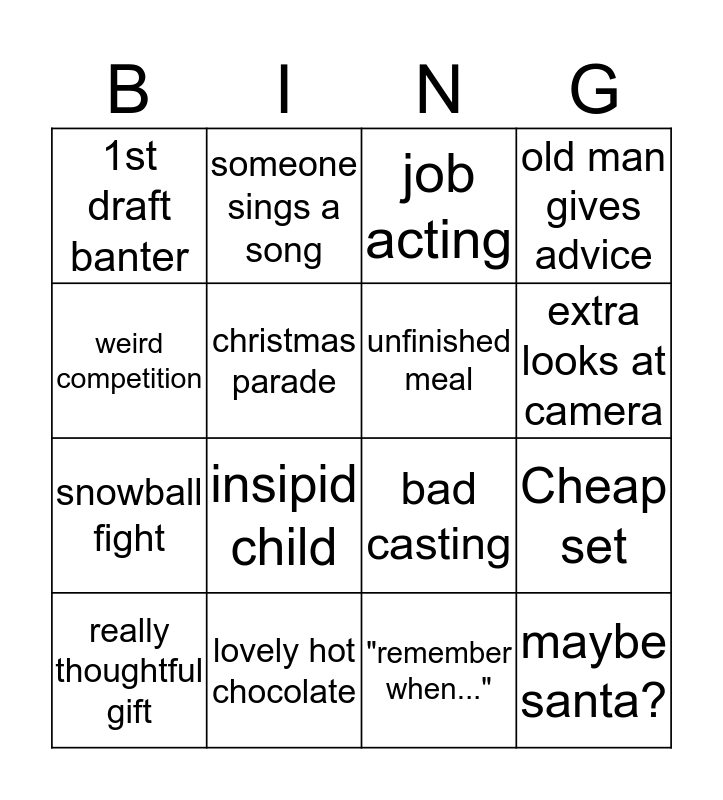 This bingo card has 20 words: Cheap set, amazed by xmas tree/lights, job acting, big business vs small, really thoughtful gift, weird competition, lovely hot chocolate, 1st draft banter, snowball fight, someone sings a song, insipid child, bad casting, christmas parade, maybe santa?, unfinished meal, true meaning of christmas, extra looks at camera, old man gives advice, "remember when..." and fake snow stuck in hair.