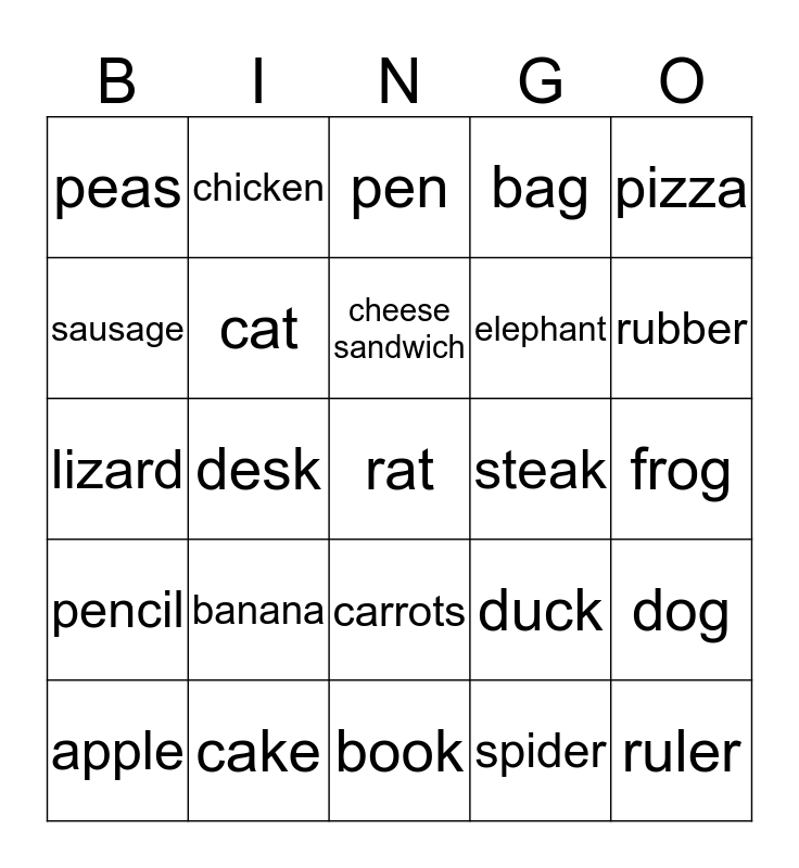 This bingo card has a free space and 24 words: banana, cake, cheese sandwich, apple, pizza, peas, sausage, chicken, steak, carrots, elephant, lizard, duck, dog, cat, spider, frog, pen, rubber, desk, ruler, pencil, bag and book.