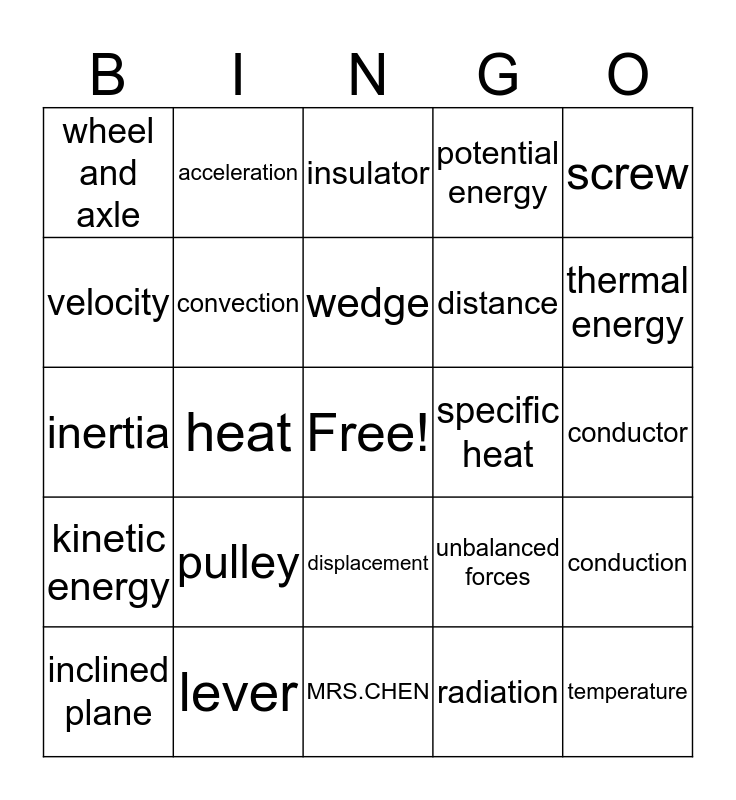 This bingo card has a free space and 24 words: pulley, lever, wedge, inclined plane, screw, wheel and axle, velocity, acceleration, specific heat, displacement, distance, inertia, unbalanced forces, conduction, convection, radiation, conductor, insulator, thermal energy, heat, temperature, kinetic energy, potential energy and MRS.CHEN.