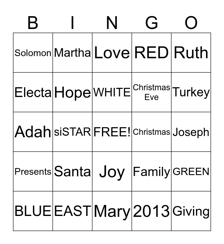 This bingo card has a free space and 30 words: EAST, O.E.S, siSTAR, Brother, Solomon, Love, Hope, Joy, Christmas, Mary, Joseph, Giving, 2013, Holiday, Turkey, Friends, Family, Presents, Santa, Ruth, Adah, Esther, Martha, Christmas Eve, Electa, RED, GREEN, BLUE, WHITE and YELLOW.