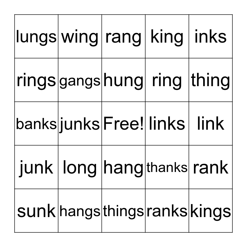 This bingo card has a free space and 40 words: bank, banks, gang, gangs, hangs, hang, hung, ink, inks, junk, junks, king, kings, link, links, long, lung, lungs, pink, rang, rank, ranks, ring, rings, sang, sank, sing, sings, song, songs, sung, sunk, thank, thanks, thing, things, think, thinks, wing and wings.