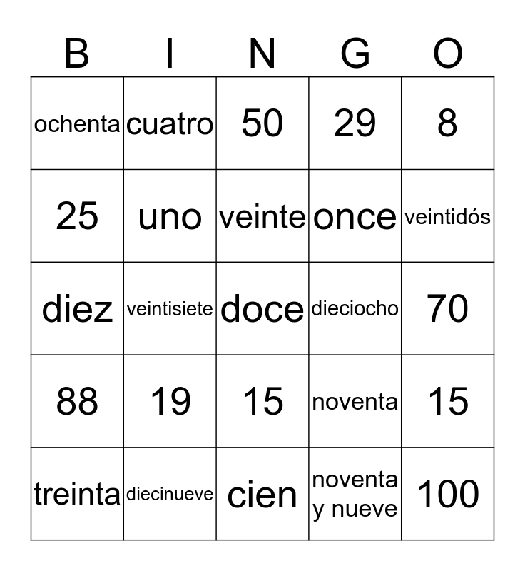 This bingo card has 25 words: 19, cien, veinte, treinta, 8, ochenta, 25, cuatro, dieciocho, 15, once, diez, noventa, 15, uno, 100, 70, 50, veintidós, veintisiete, doce, diecinueve, 88, 29 and noventa y nueve.