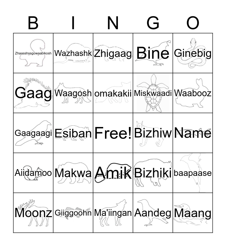 This bingo card has 29 images, a free space and 29 words: Moonz, Waabiganoojii, Esiban, Waawaashkeshi, Zhaasshssgowaabikosh, Zhigaag, Waagosh, Makwa, Bizhiw, Giiggoohn, Name, Maang, Ma'iingan, Aandeg, Waabooz, Migizi, Amik, Aiidamoo, Ginebig, Gaagaagi, Bizhiki, Zhiishiib, Miskwaadi, Gaag, Bine, Wazhashk, baapaase, omakakii and gookooko'oo.