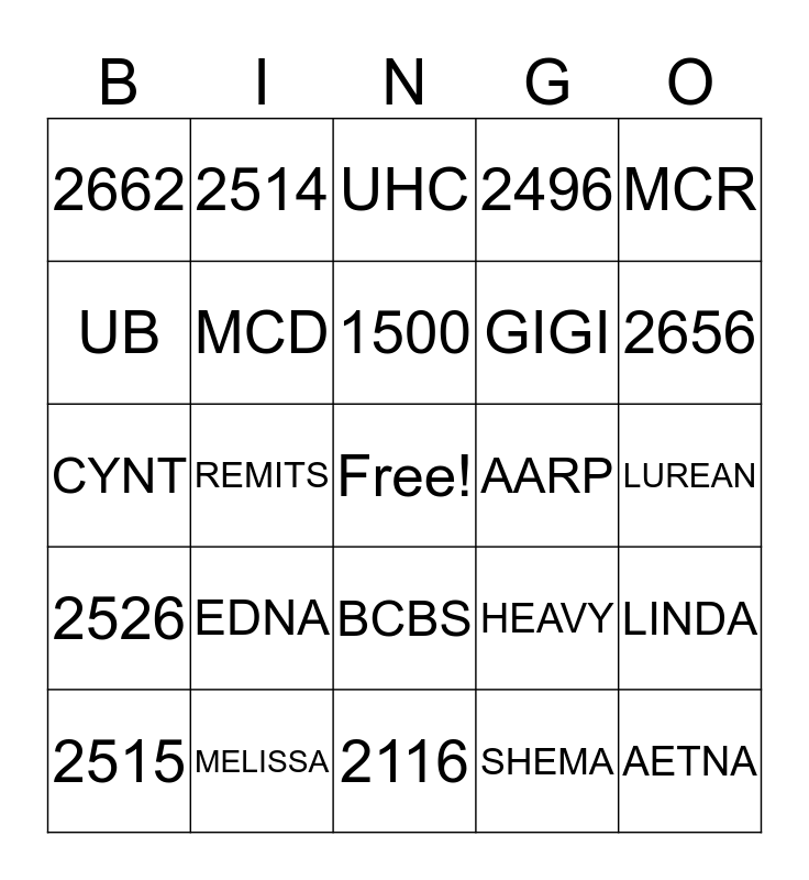 This bingo card has a free space and 24 words: EDNA, MELISSA, 1500, 2515, MCR, 2662, UB, 2514, AARP, BCBS, GIGI, CYNT, HEAVY, LINDA, MCD, SHEMA, LUREAN, UHC, 2656, REMITS, AETNA, 2526, 2496 and 2116.