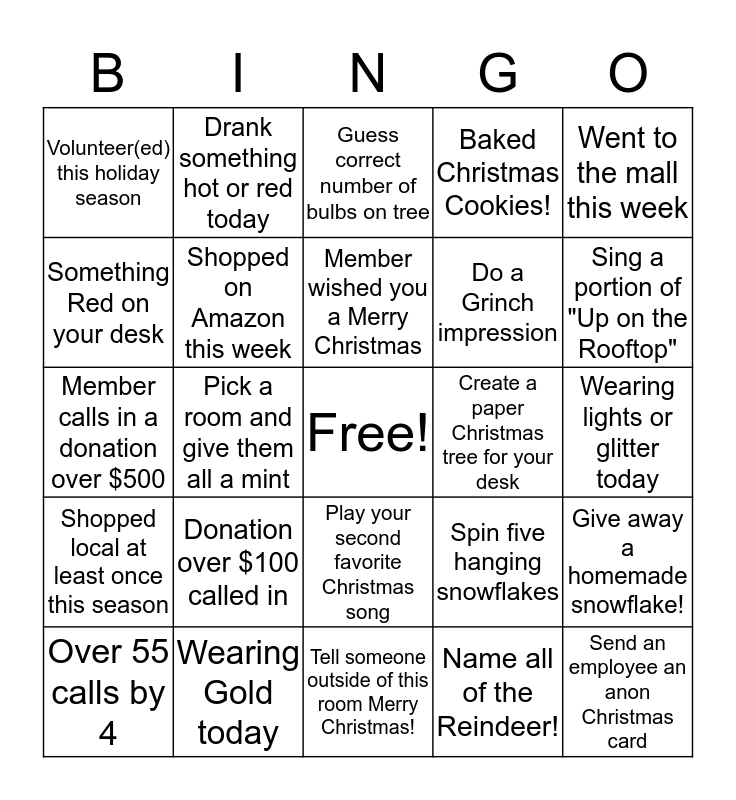 This bingo card has a free space and 24 words: Donation over $100 called in, Wearing Gold today, Member wished you a Merry Christmas, Over 55 calls by 4, Went to the mall this week, Volunteer(ed) this holiday season, Something Red on your desk, Drank something hot or red today, Create a paper Christmas tree for your desk, Play your second favorite Christmas song, Do a Grinch impression, Member calls in a donation over $500, Spin five hanging snowflakes, Give away a homemade snowflake!, Shopped on Amazon this week, Name all of the Reindeer!, Wearing lights or glitter today, Guess correct number of bulbs on tree, Sing a portion of "Up on the Rooftop", Pick a room and give them all a mint, Send an employee an anon Christmas card, Shopped local at least once this season, Baked Christmas Cookies! and Tell someone outside of this room Merry Christmas!.