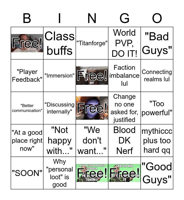This bingo card has 4 images, a free space and 24 words: "Not happy with...", Why "personal loot" is good, Free!, "SOON", "Bad Guys", Free!, "Player Feedback", Class buffs, Change no one asked for, justified, "We don't want...", Faction imbalance lul, "Better communication", Blood DK Nerf, mythiccc plus too hard qq, "Immersion", Free!, "Too powerful", "Titanforge", Connecting realms lul, "Discussing internally", "Good Guys", "At a good place right now", World PVP, DO IT! and Free!.