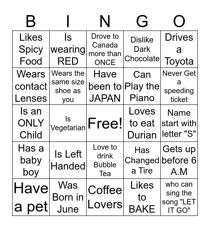 This bingo card has a free space and 24 words: Is Left Handed, Was Born in June, Have been to JAPAN, Have a pet, Drives a Toyota, Likes Spicy Food, Wears contact Lenses, Is wearing RED, Loves to eat Durian, Love to drink Bubble Tea, Can Play the Piano, Is an ONLY Child, Has Changed a Tire, Gets up before 6 A.M, Wears the same size shoe as you, Likes to BAKE, Name start with letter "S", Drove to Canada more than ONCE, Never Get a speeding ticket, Is Vegetarian, who can sing the song "LET IT GO", Has a baby boy, Dislike Dark Chocolate and Coffee Lovers.