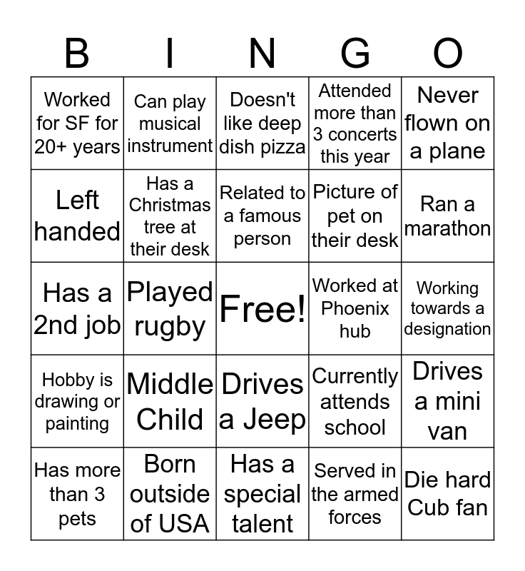 This bingo card has a free space and 24 words: Middle Child, Born outside of USA, Related to a famous person, Has more than 3 pets, Never flown on a plane, Worked for SF for 20+ years, Left handed, Can play musical instrument, Worked at Phoenix hub, Drives a Jeep, Picture of pet on their desk, Has a 2nd job, Currently attends school, Drives a mini van, Has a Christmas tree at their desk, Served in the armed forces, Working towards a designation, Doesn't like deep dish pizza, Ran a marathon, Played rugby, Die hard Cub fan, Hobby is drawing or painting, Attended more than 3 concerts this year and Has a special talent.