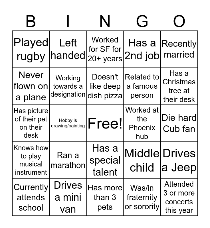 This bingo card has a free space and 27 words: Middle child, Born outside of USA, Related to a famous person, Has more than 3 pets, Never flown on a plane, Worked for SF for 20+ years, Left handed, Knows how to play musical instrument, Worked at the Phoenix hub, Drives a Jeep, Has picture of their pet on their desk, Has a 2nd job, Currently attends school, Drives a mini van, Has a Christmas tree at their desk, Served in armed forces, Working towards a designation, Doesn't like deep dish pizza, Ran a marathon, Played rugby, Die hard Cub fan, Was/in fraternity or sorority, Hobby is drawing/painting, Attended 3 or more concerts this year, Has a special talent, Recently married and Recently had a baby.
