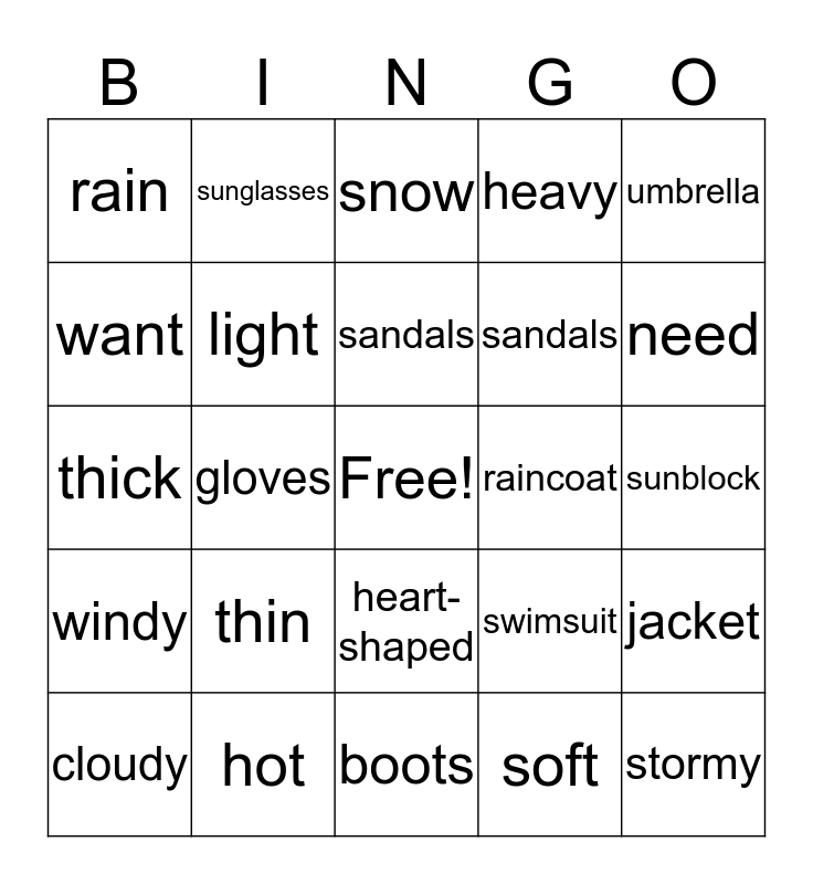 This bingo card has a free space and 29 words: cloudy, coat, gloves, sunny, rain, snow, light, thin, raincoat, hot, sunblock, stormy, boots, soft, need, earmuffs, heart-shaped, windy, umbrella, thick, swimsuit, square, sandals, want, heavy, sunglasses, jacket, sandals and wet.