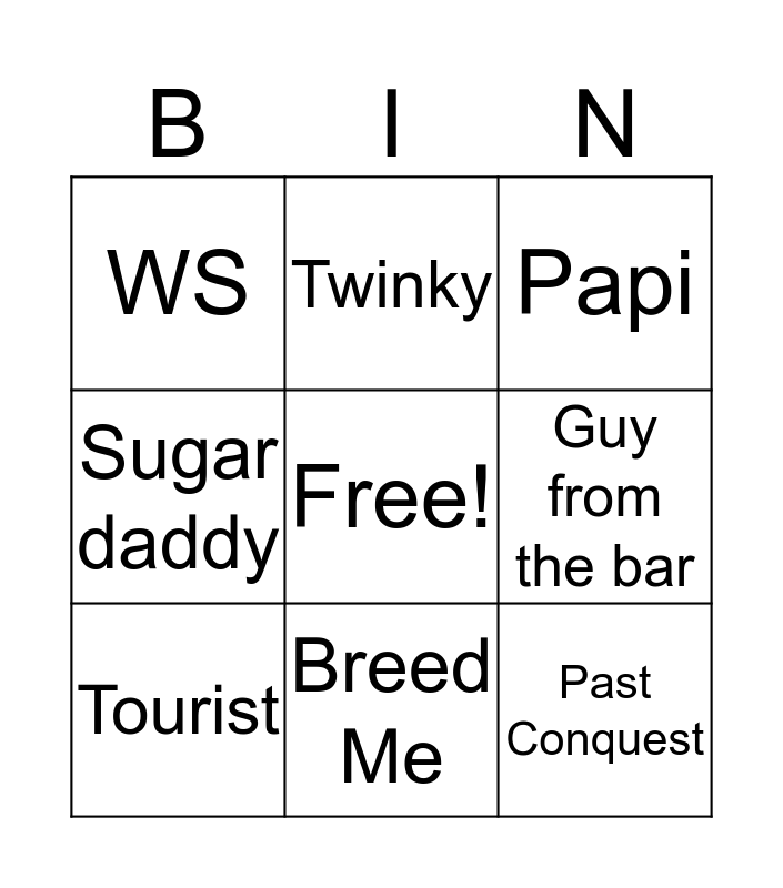 This bingo card has a free space and 11 words: PnP, Breed Me, Past Conquest, Tourist, Twinky, Papi, Guy from the bar, Threesome, Sugar daddy, WS and Kinky.