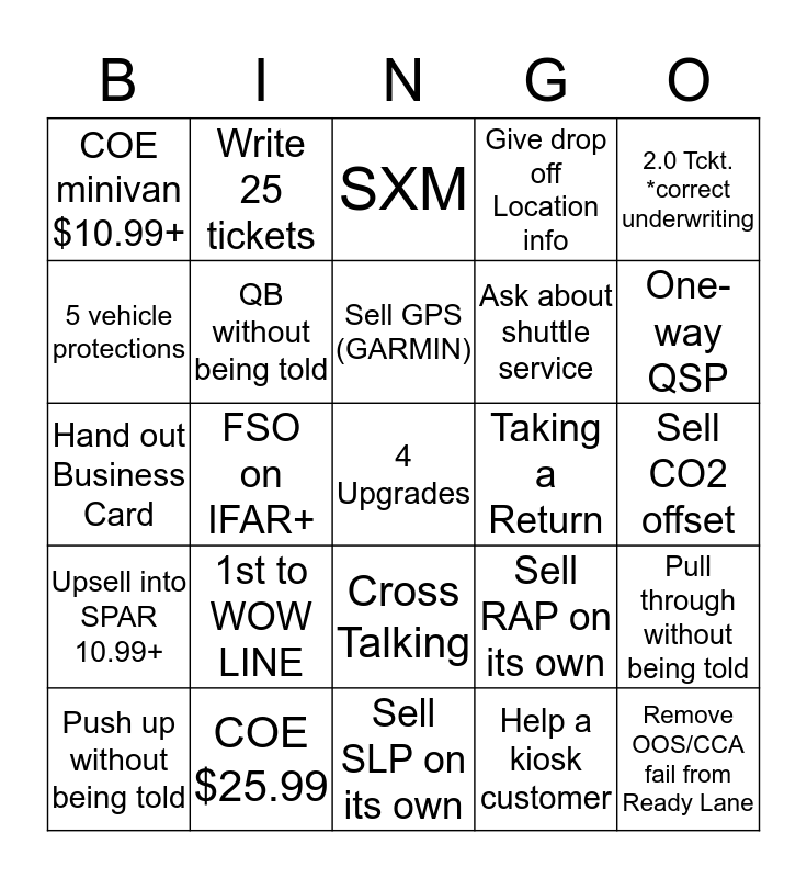 This bingo card has 30 words: COE $25.99, BOAT, FSO on IFAR+, COE $10.99, COE minivan $10.99+, SXM, QB without being told, Cross Talking, Taking a Return, Sell SLP on its own, Sell CO2 offset, 4 Upgrades, Help a kiosk customer, Remove OOS/CCA fail from Ready Lane, One-way QSP, 20+ day ticket, Sell RAP on its own, Upsell into SPAR 10.99+, 1st to WOW LINE, 2.0 Tckt. *correct underwriting, Hand out Business Card, Car Seat, Write 25 tickets, Ask about shuttle service, 5 vehicle protections, Give drop off Location info, Pull through without being told, Push up without being told, Sell GPS (GARMIN) and Upgrade out of XXAR.