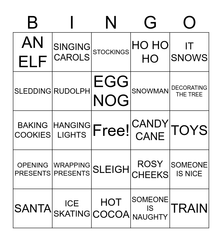 This bingo card has a free space and 24 words: WRAPPING PRESENTS, ICE SKATING, EGG NOG, SANTA, IT SNOWS, AN ELF, SLEDDING, SINGING CAROLS, CANDY CANE, SLEIGH, SNOWMAN, BAKING COOKIES, ROSY CHEEKS, SOMEONE IS NICE, RUDOLPH, SOMEONE IS NAUGHTY, TOYS, STOCKINGS, DECORATING THE TREE, HANGING LIGHTS, TRAIN, OPENING PRESENTS, HO HO HO and HOT COCOA.