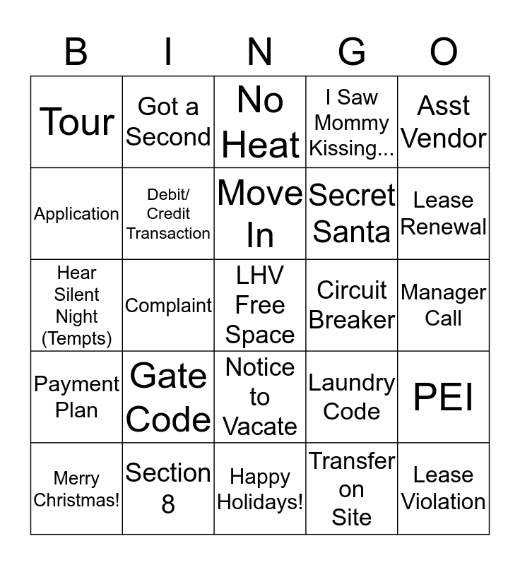 This bingo card has a free space and 29 words: Merry Christmas!, Work Order, Complaint, Resident Lock Out, Tour, No Heat, Debit/ Credit Transaction, Gate Code, Circuit Breaker, Section 8, Manager Call, Lease Violation, Happy Holidays!, Transfer on Site, Lease Renewal, Balance, Notice to Vacate, Payment Plan, Asst Vendor, Hear Silent Night (Tempts), Laundry Code, Prospect Call, Secret Santa, Application, I Saw Mommy Kissing..., Got a Second, PEI, Move In and Bug List.