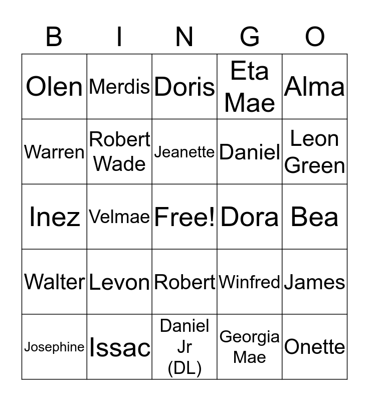 This bingo card has a free space and 24 words: Levon, Issac, Jeanette, Josephine, Alma, Olen, Warren, Merdis, Dora, Robert, Daniel, Inez, Winfred, James, Robert Wade, Georgia Mae, Bea, Doris, Leon Green, Velmae, Onette, Walter, Eta Mae and Daniel Jr (DL).