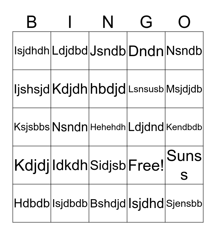 This bingo card has 25 words: Idkdh, Bshdjd, hbdjd, Hdbdb, Nsndb, Isjdhdh, Ijshsjd, Ldjdbd, Ldjdnd, Sidjsb, Lsnsusb, Ksjsbbs, Free!, Suns s, Kdjdh, Sjensbb, Kendbdb, Jsndb, Msjdjdb, Nsndn, Hehehdh, Isjdbdb, Kdjdj, Dndn and Isjdhd.