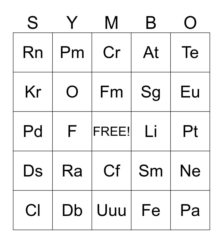 This bingo card has a free space and 118 words: Ac, Al, Am, Sb, Ar, As, At, Ba, Bk, Be, Bi, Bh, B, Br, Cd, Ca, Cf, C, Ce, Cs, Cl, Cr, Co, Cu, Cm, Ds, Db, Dy, Es, Er, Eu, Fm, F, Fr, Gd, Ga, Ge, Au, Hf, Hs, He, Ho, H, In, I, Ir, Fe, Kr, La, Lr, Pb, Li, Lu, Mg, Mn, Mt, Md, Hg, Mo, Nd, Ne, Np, Ni, Nb, N, No, Os, O, Pd, P, Pt, Pu, Po, K, Pr, Pm, Pa, Ra, Rn, Re, Rh, Rb, Ru, Rf, Sm, Sc, Sg, Se, Si, Ag, Na, Sr, S, Ta, Tc, Te, Tb, Tl, Th, Tm, Sn, Ti, W, Uub, Uuh, Uuo, Uup, Uuq, Uus, Uut, Uuu, U, V, Xe, Yb, Y, Zn and Zr.