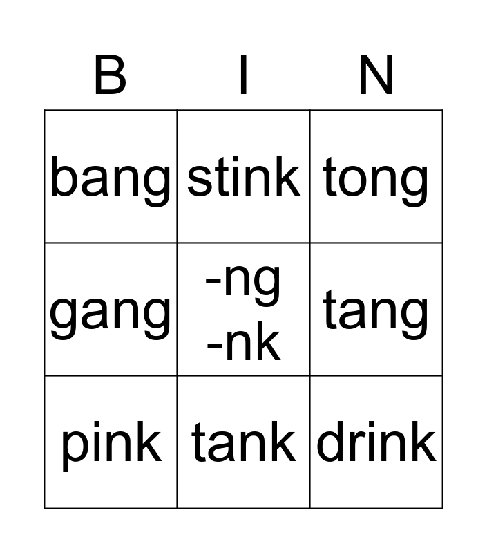 This bingo card has a free space and 17 words: ring, ding, tong, bang, lang, gang, zink, pink, tank, tang, bank, mank, drink, stink, kring, dank and frank.