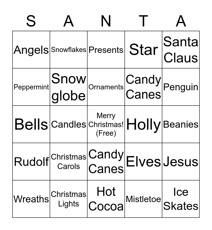 This bingo card has a free space and 34 words: Christmas Tree, Mistletoe, Christmas Cards, Snowmen, Rudolf, Snow globe, Santa Claus, Wreaths, Snowflakes, Ginger bread men, Ornaments, Presents, Santa's Sleigh, Stockings, Holly, Penguin, Christmas Lights, Bells, Christmas Carols, Elves, Candy Canes, Toys, Angels, Beanies, Hot Cocoa, Ice Skates, Star, Christmas Lights, Candy Canes, Peppermint, Ho Ho Ho, Candles, Jesus and Sled.