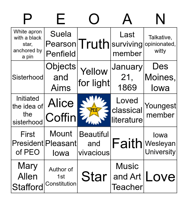 This bingo card has a free space and 43 words: Alice Bird Babb, Alice Coffin, Ella Stewart, Franc Roads Elliott, Hattie Briggs Bousquet, Mary Allen Stafford, Suela Pearson Penfield, Seven, January 21, 1869, Iowa Wesleyan University, Sisterhood, Mount Pleasant Iowa, Star, Music and Art Teacher, Art Institute of Chicago, First President of PEO, White for purity, Yellow for light, Marguerite, Des Moines, Iowa, White apron with a black star, anchored by a pin, Excellent seamstress, Beautiful and vivacious, Last surviving member, Taught piano lessons, Initiated the idea of the sisterhood, Gave the name PEO to the sisterhood, Prolific writer, Chair of Latin & Greek Dept at Iowa Wesleyan, Youngest member, Oldest member, Author of 1st Constitution, Quiet and mild mannered, Faith, Love, Purity, Justice, Truth, Loved classical literature, Talkative, opinionated, witty, Ode, Objects and Aims and Chapter AN.
